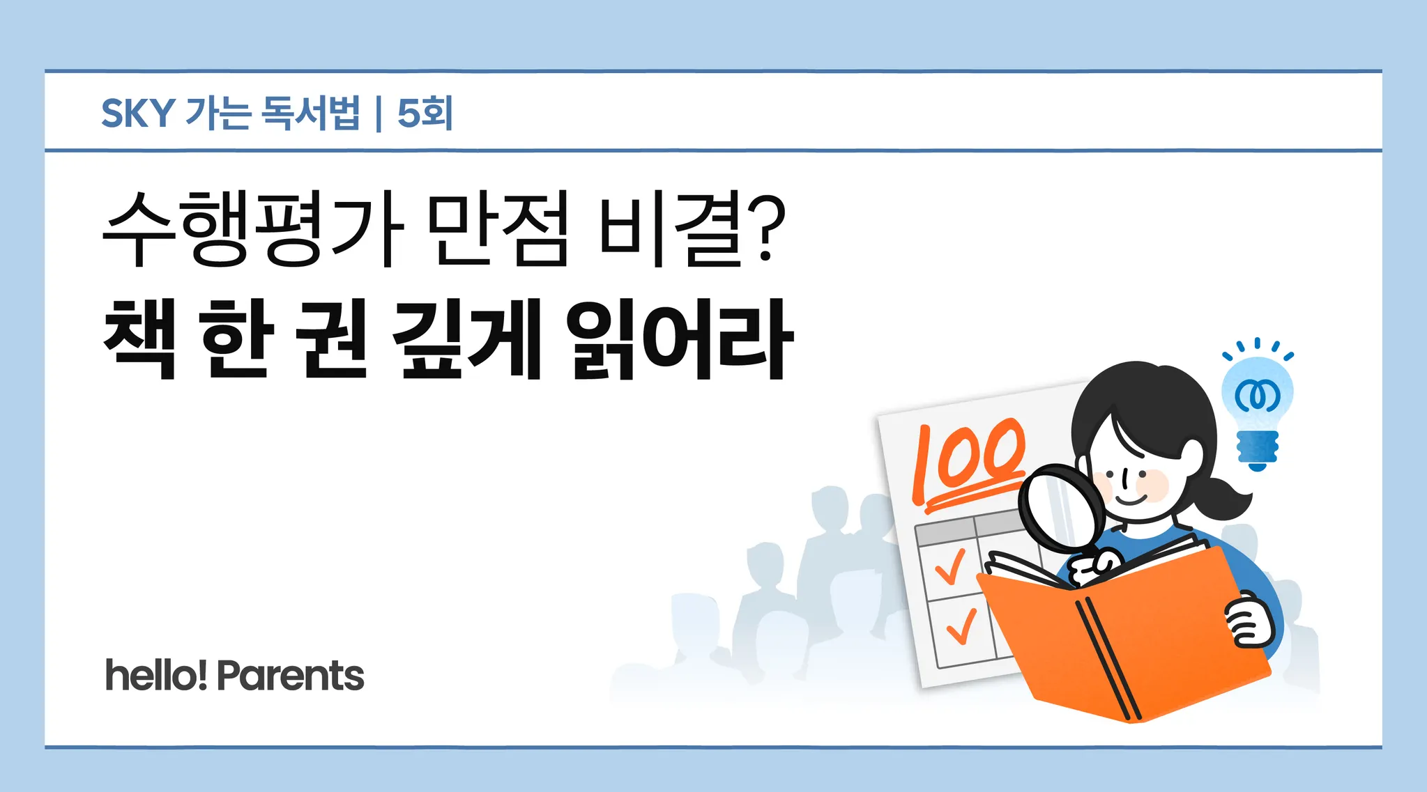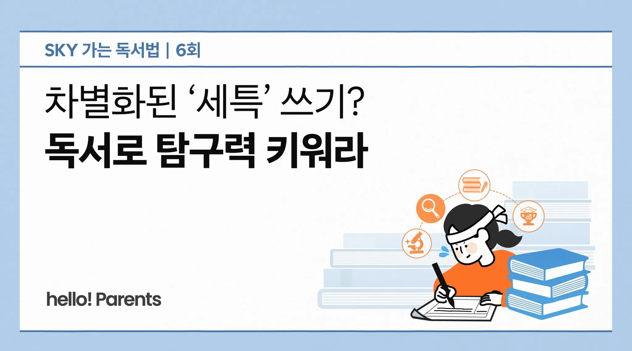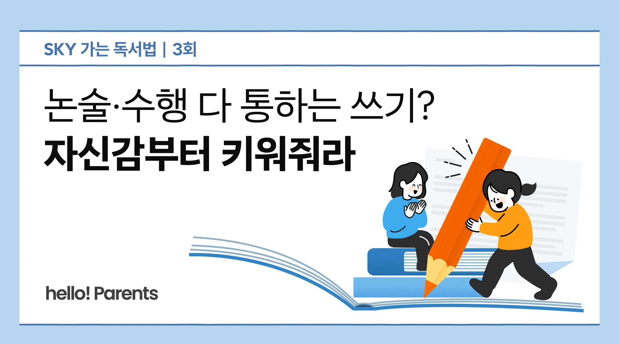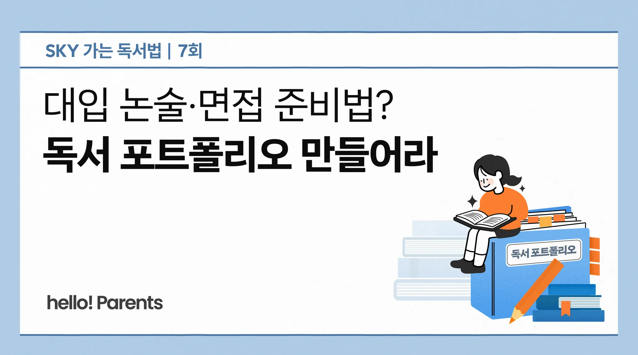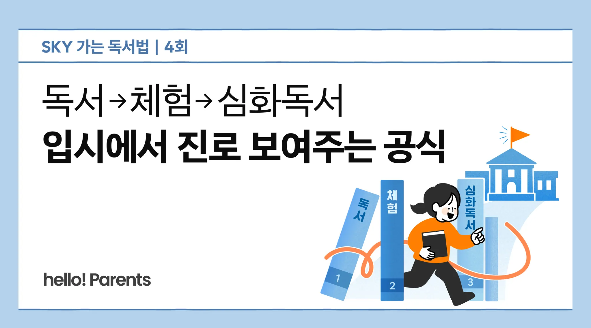 막상 책을 읽히자니 어디서부터 어떻게 시작해야 할지 막막합니다. 대입이나 독서에 대한 정보는 많지만, ‘대입에 도움이 되는 독서 정보’는 찾기 어렵거든요. hello! Parents가 김수미 독서문화연구원 대표와 함께 ‘SKY 가는 독서법’을 시작하는 이유죠. 김 대표는 서울 강남 대치동에서 매년 1만 명이 넘게 대기하는 학원 ‘논술화랑’ ‘수행과 수능’을 운영 중입니다. 앞으로 7회에 걸쳐 대입에서 힘을 발휘하는 초등 독서법을 소개합니다.